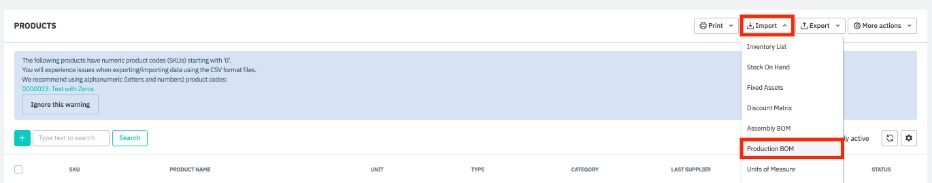 Select Export then Production BOM to export a CSV file of all existing production BOMs from Cin7 Core.