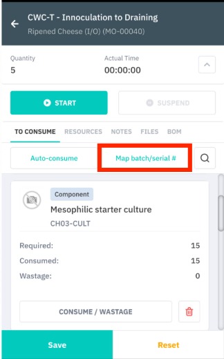Components can be mapped once they have been reserved (only possible through the web portal) or consumed (possible through MES app or web portal). Completing a production operation will consume the components used in that operation automatically.