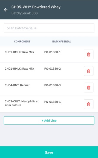 Use Add line or Scan to add an additional component batch, if required. This tab can be edited and updated until the order is completed. Save