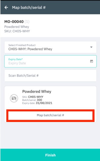 scan the batch/serial number and enter an expiry date to add a finished product to the mapping list. The finished products will be displayed below these fields.
