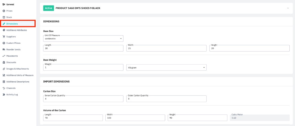 Set the dimensions, weight, and unit of measure for a product from the Dimensions tab. Here you can also set import dimensions, such as the carton volume and pack quantity. Setting the dimensions and weight of an item is required to use most fulfillment services.