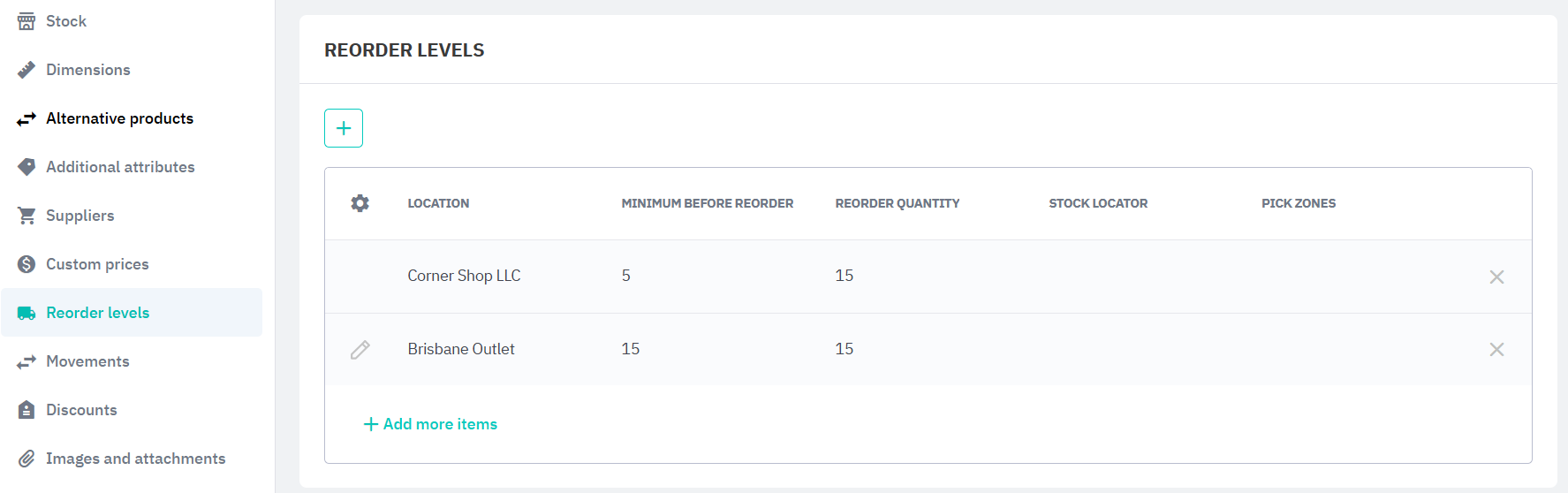 Set low stock reorder levels for different locations for this product. This includes the Minimum before reorder quantity and Reorder quantity. You can also include a Stock locator and Pick zone for the product at each location.