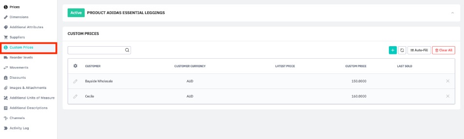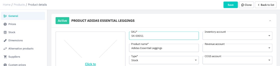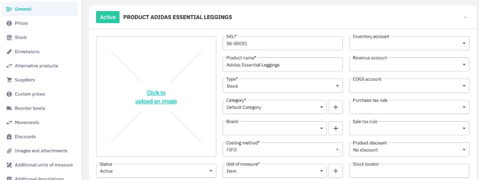 Tabs such as Prices, Dimensions, Suppliers hold additional product information. Some of this information is optional, while some is required before you can use other Cin7 Core features. For example, entering supplier information for a product is required before you can drop ship that product.