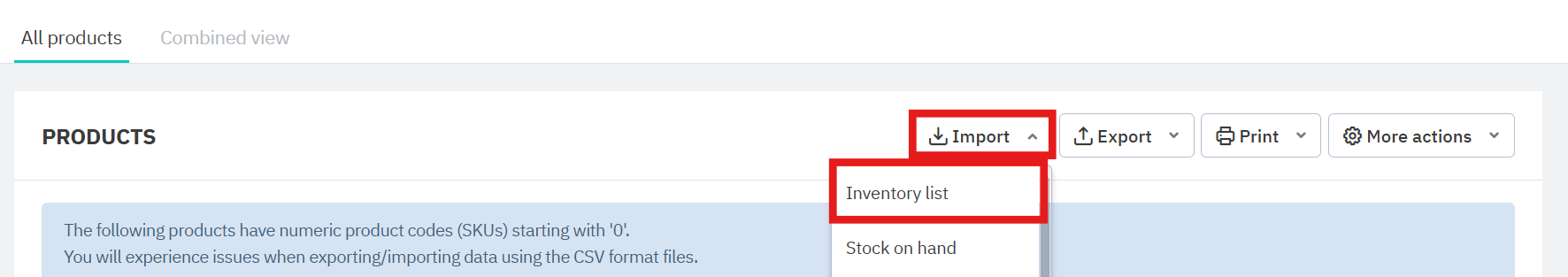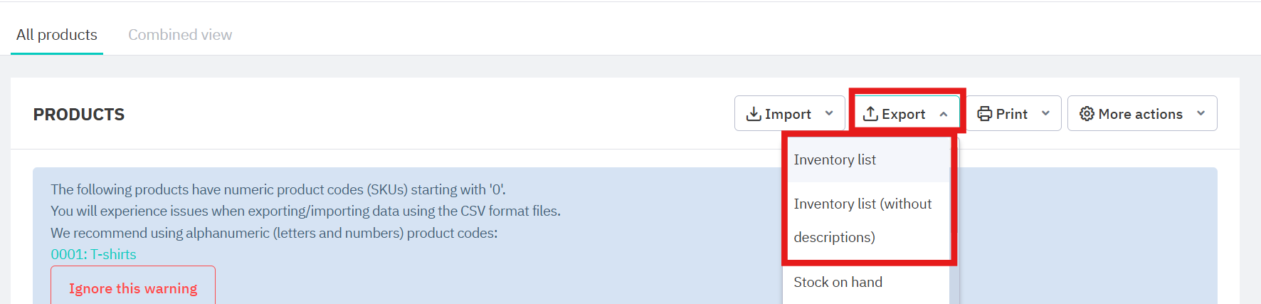 Click Export, then Inventory list (with or without descriptions). This downloads a CSV file with the product details.