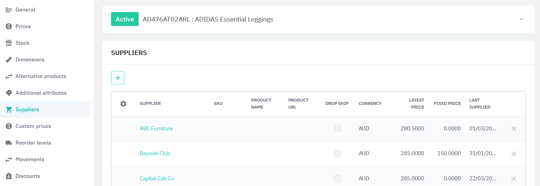 Add suppliers and supplier prices to a product to use Cin7 CoreDropship, Low stock reorder, Backorder, MRP, and more of our automatic replenishment features. You can also set reorder parameters from this tab.