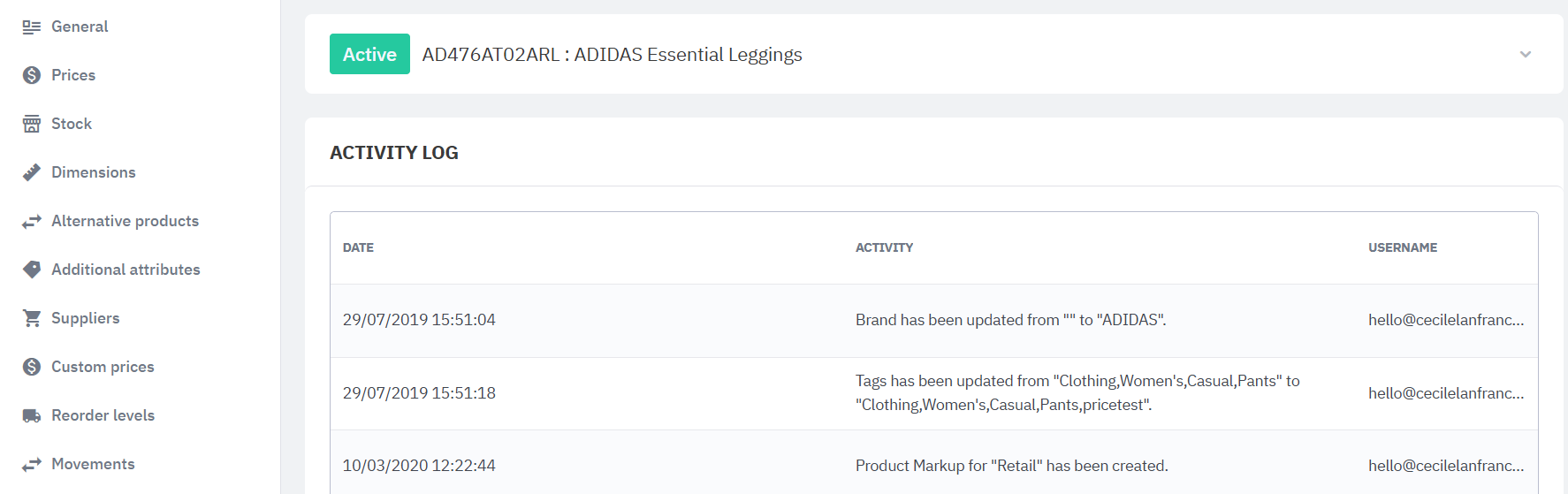 View every change to the product's record including timestamp and user identity from the Activity log tab.