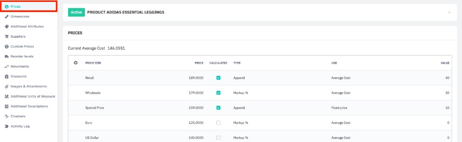 Set up to 10 prices for each product using price tiers. Prices can be set manually or dynamically calculated, for example adding a markup percentage to your average cost or supplier price. You can import prices via CSV too.