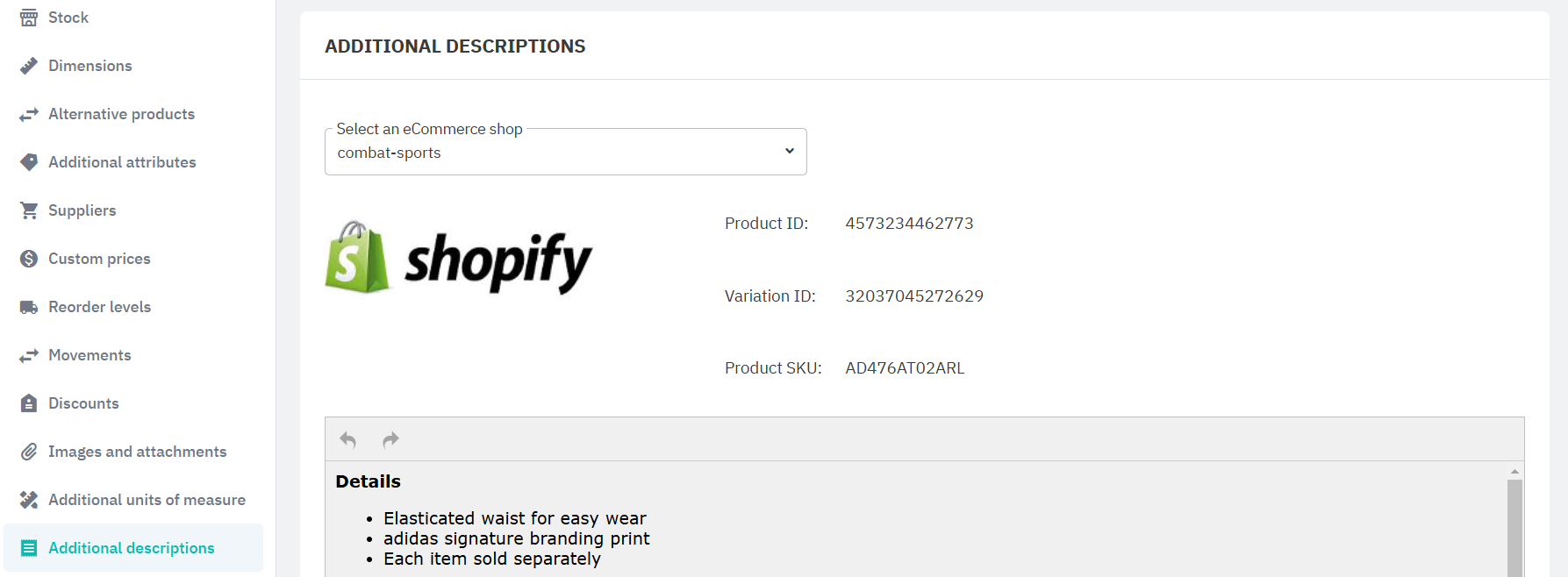 Add descriptions for connected sales channels on the Additional descriptions tab. This lets you have different descriptions for different ecommerce stores to your description in Cin7 Core.