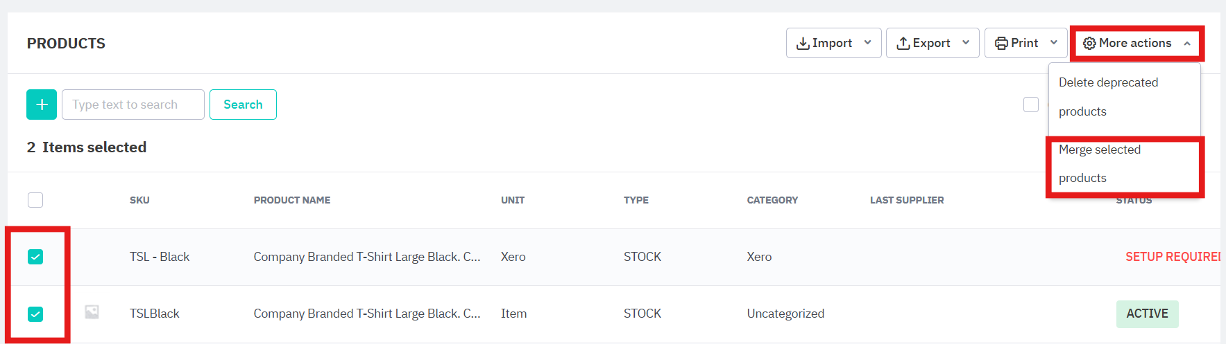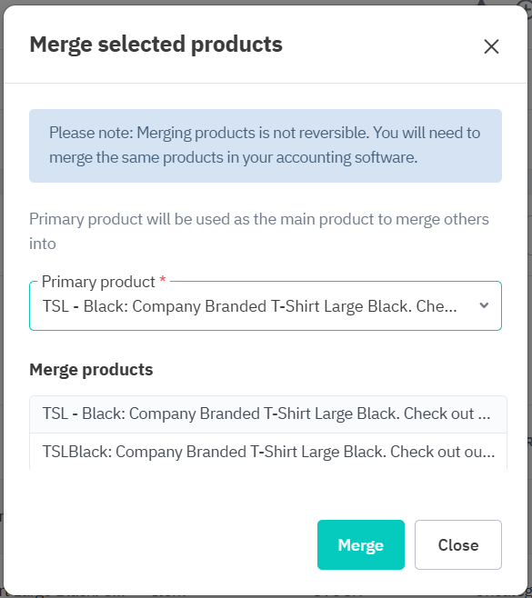 Select the primary product record and click Merge to confirm. All merged products will take the values of the primary product.