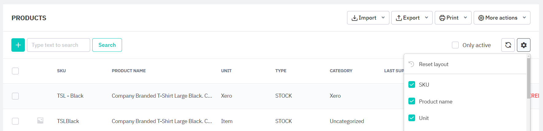 Customize the appearance of your product list by clicking Settings. This lets you add and remove columns to the table. Use Reset layout to return to the default Cin7 Core layout.