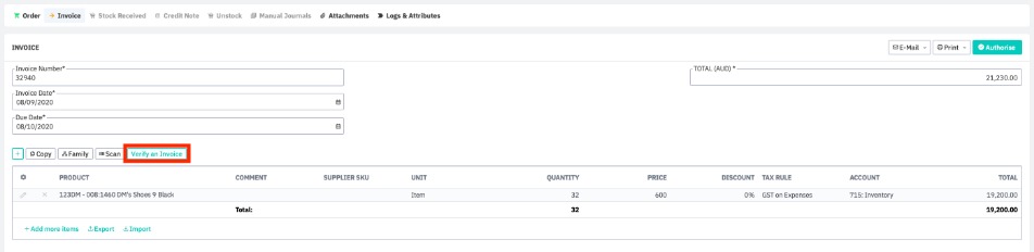 When at the Invoice stage of a purchase order, click Verify invoice to open the verify screen. This is the same for simple or advanced purchases.