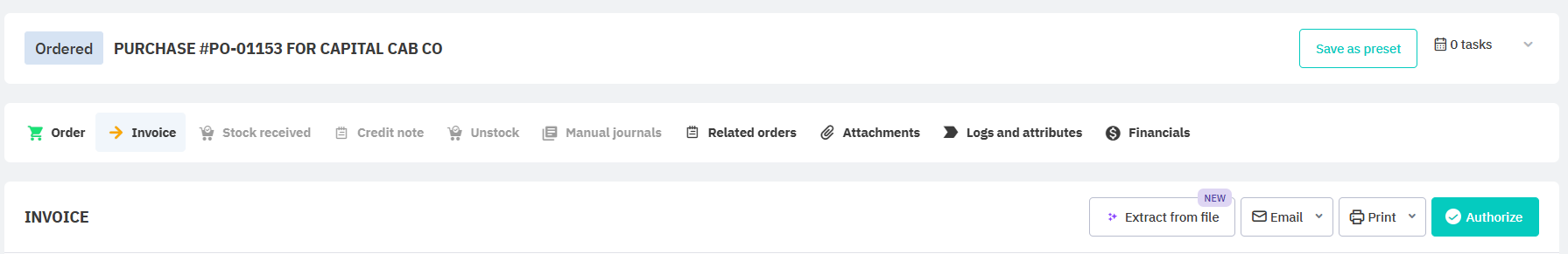 Open a purchase order with an authorized invoice.