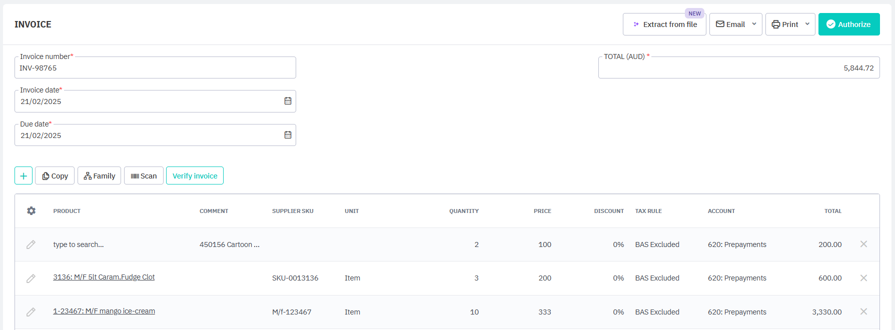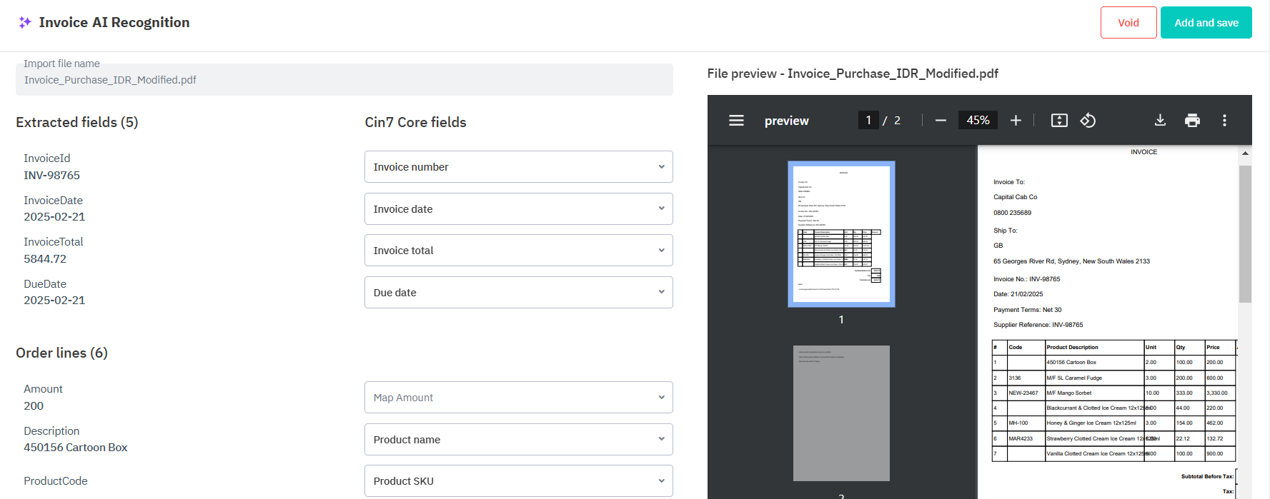 Check that your invoice lines are correct and edit any incorrect matches. Purchase IDR uses AI to match invoiced products with the linked purchase order, without requiring exact matches for name and SKU in the supplier's invoice.