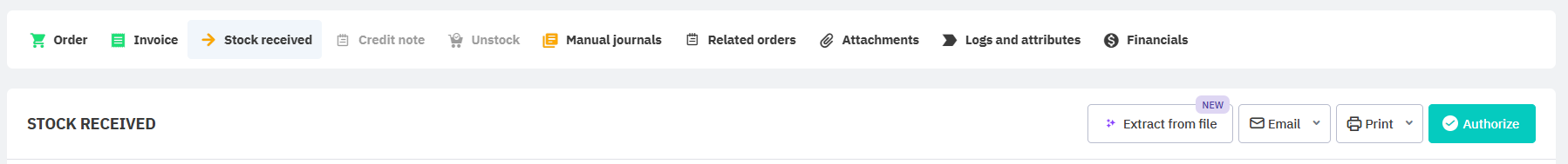 Open an authorized purchase order. If you process purchases Stock first, Stock received must also be authorized.