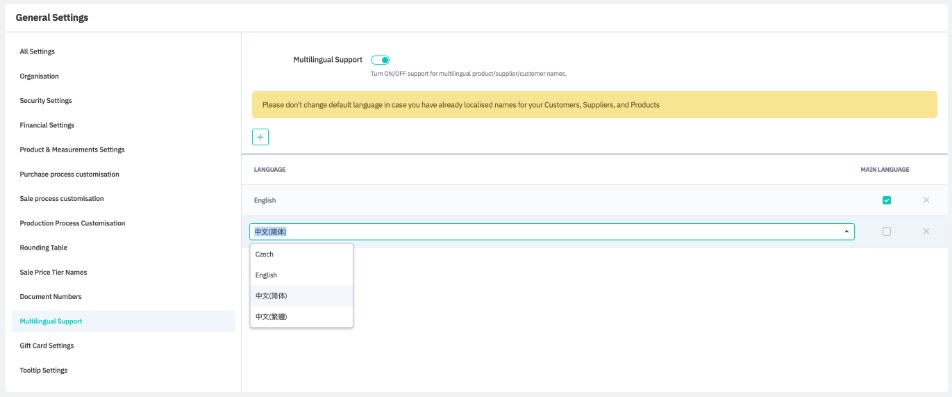 Do not change your Main Language if you have already added alternative languages names to products, customers, or suppliers.