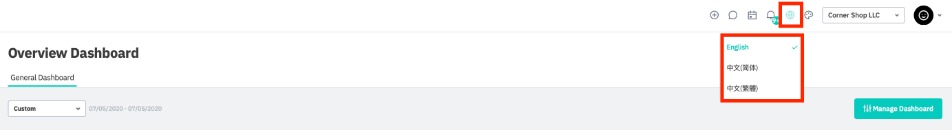 To change the language of your Cin7 Core interface, click the globe icon in the toolbar and choose your language: