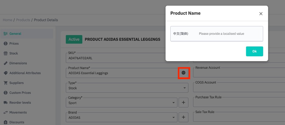 Beside the name of the product, customers, or supplier, click the globe icon.