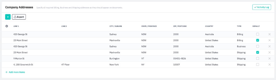 To export your company addresses to a CSV file, click Export. To view historical changes to your company addresses, open the Activity Log.