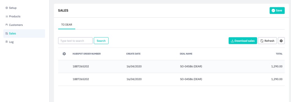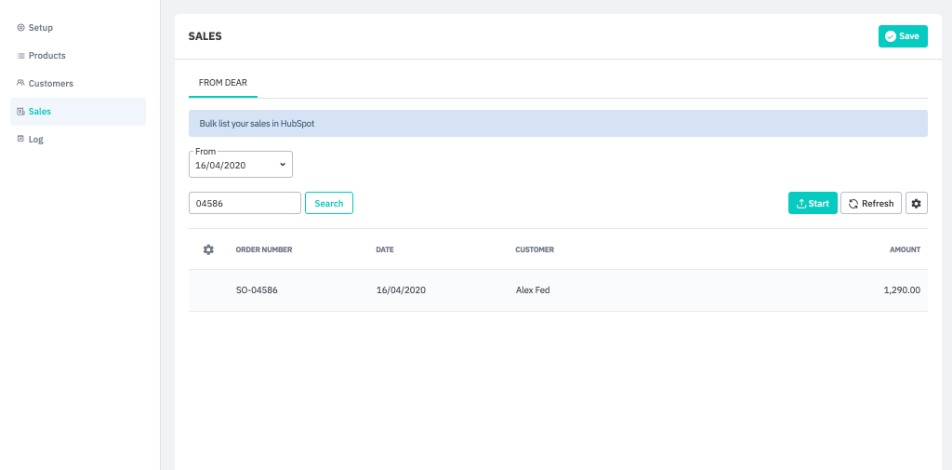 If you have HubSpot sales already imported, they will be listed here. If not, the screen will be blank. View, filter, and search for your sales from here. Click Refresh to make sure the sales list has the most recent information.