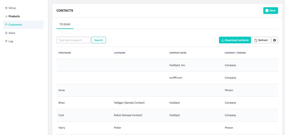 If you have HubSpot contacts already imported, they will be listed here. If not, the screen will be blank. If auto-sync is enabled, any new Hubspot contacts or updates to listed contacts will be imported automatically. You can also manually import customers and contacts: