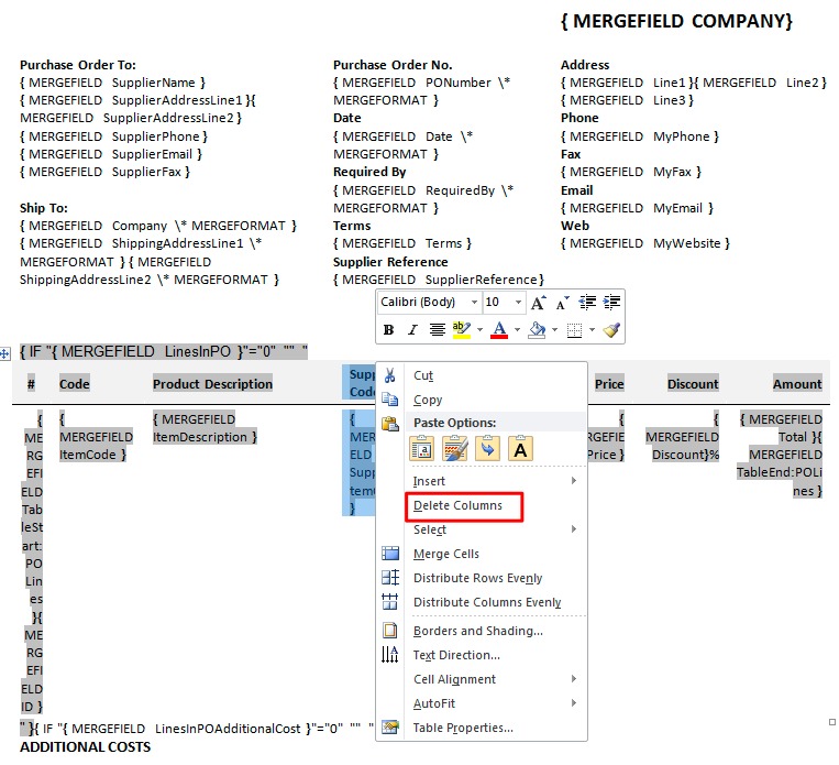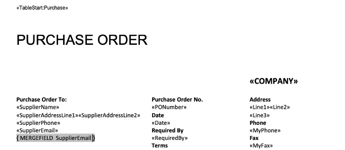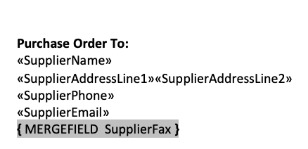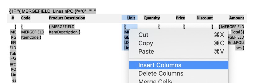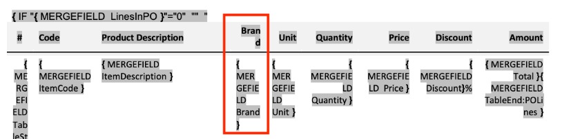 The same works in reverse when adding columns. You will need to reveal the table and all the hidden merge fields to and insert a column. In this example, we will add a column for the product brand to the purchase order lines table.