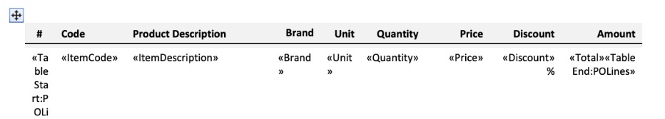 The TableStart/TableEnd tags show us that this is a POLines table – we can go to the POLines table in POLines table in Mail Merge purchase KB to find the product brand code.