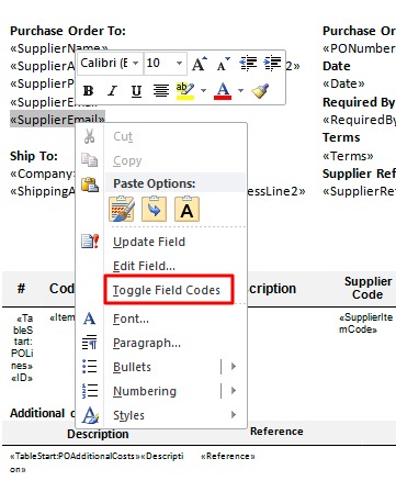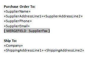 If you wanted to change or add any of the information for the supplier, you will need to copy an existing field, paste it back in, then right-click on the field to toggle field codes, which will essentially show the contents of the field.