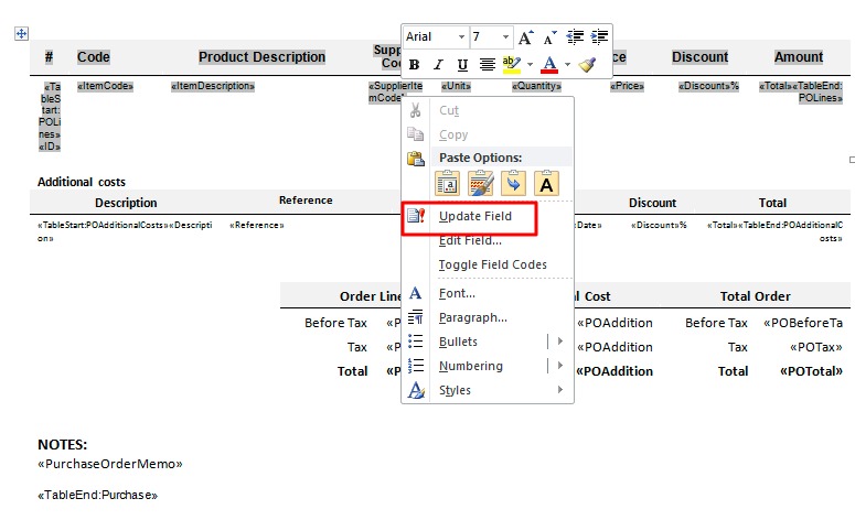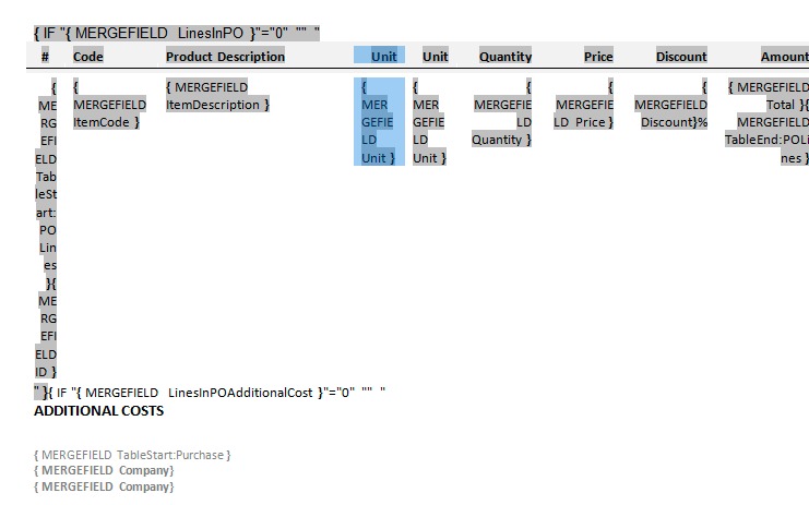 We need to return to purchase mailmerge article, find the PO Lines table and then copy AdditionalAttribute1, return to the template and then replace Unit with Description, press ALT+F9 to hide the field, and then update it. This table will now be included in the extra column which will be used to complete the item’s description.