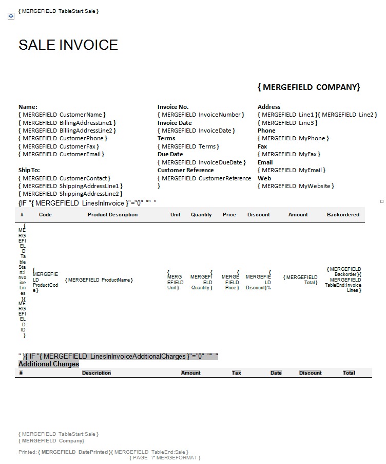 Mail merge fields for sale process, combined sales, and customer statement templates