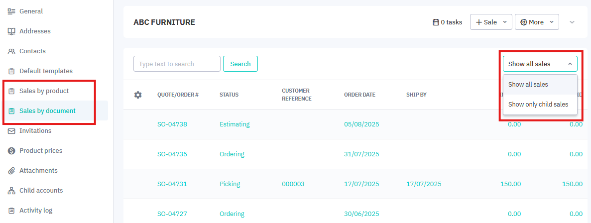 You can view these combined histories on the Sales by product and Sales by document tabs of the customer records. Use the filter to Show all sales or Show only parent/child sales.