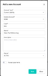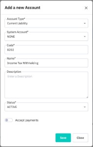 The next step is to create accounts in the chart of accounts and configure the withholding tax rules. The following accounts are required in the Chart of Accounts: