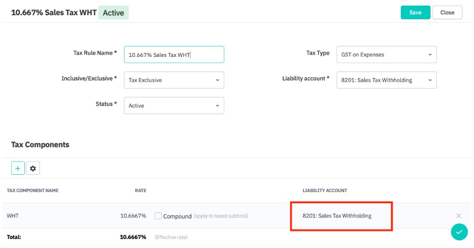 Sales Tax withholding rule - In our case, it is 10.6667%, and is linked to the Sales Tax Withholding liability account.