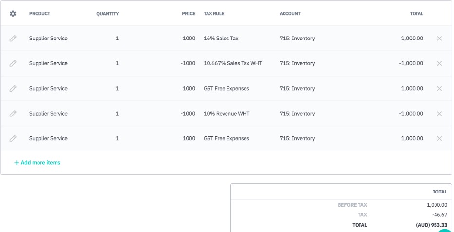 As you can see, the total paid to the supplier is 1000 before tax (the negative and positive costs have canceled each other out), and 953.33 after tax, as calculated in our requirements.
