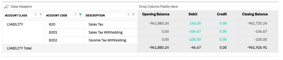 On the closure of the month, the balances are moved from the withholding accounts to the "sales tax payable” account or "income tax payable". The withholding accounts get reset to zero for the opening balance of the next month.
