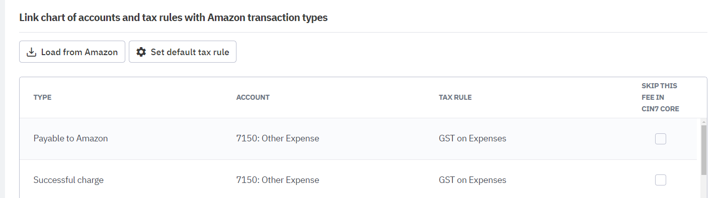 Link chart of accounts and tax rules with Amazon transaction types