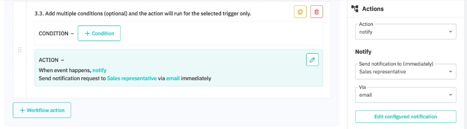 The Notify action sends a notification to selected recipients without requiring a response. Notifications can be sent via email to a single recipient, to a mailing list, or via internal notification (to users of your Cin7 Core organization, e.g, a sales representative). Mailing lists must already exist before they can be selected for notifications.