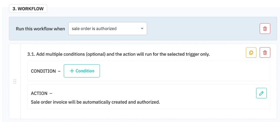 | Sale pack is authorized | Create invoice, Create and authorize invoice, and Create and authorize shipment. |