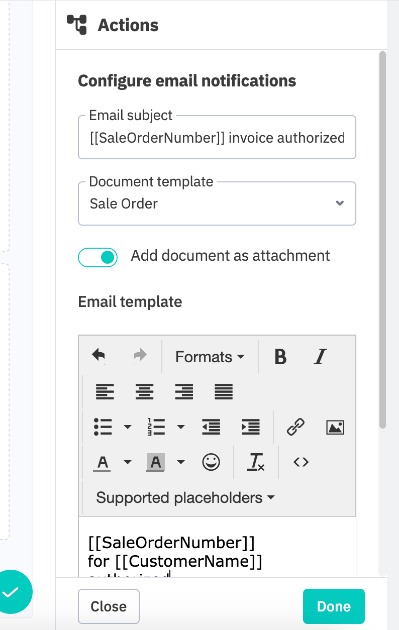 You will be given the option to edit the email template or internal notification text in the side bar Configure notification or Edit configured notification. Click Supported placeholders to enter placeholder fields into the template. For emails, you can add images directly into the body of the email by using the image icon and entering an image address.