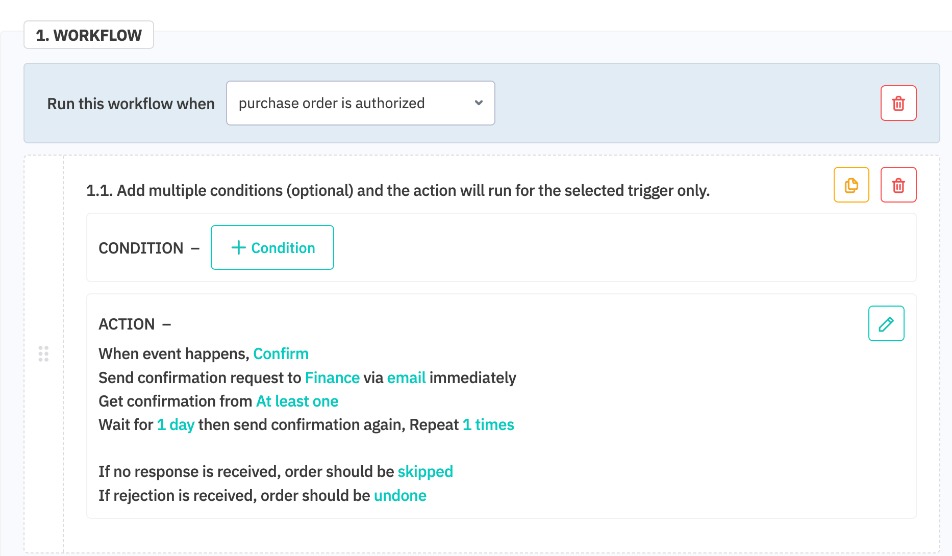 Configure the waiting period and select the retry count for sending reminders. If there is no response, select whether the system Skips (does nothing), Undo or Void the document.