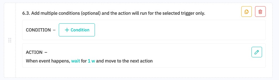 The Wait action lets a selected period of time elapse before moving on to the next action, for example, checking that a payment or refund has been made.