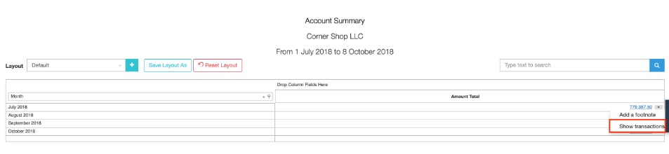 Account balance is shown per month of the reporting period. Amount Total column displays the closing account balance for that month. Hover over an Amount Total cell and click the arrow to show a dropdown menu. Click Show Transactions to click through to all transactions for that month for the selected account.