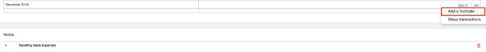 Add notes to a report for publishing by clicking the dropdown arrow in a cell and clicking Add a footnote. You will then be able to enter text in the notes field below the report. Notes text will be saved to draft or published reports.