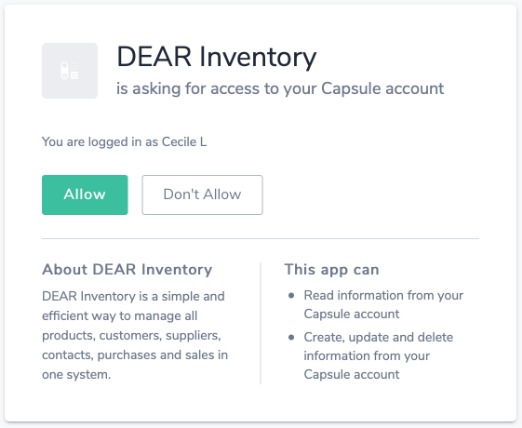 Click Allow to give Cin7 Core permission to access your Capsule account.