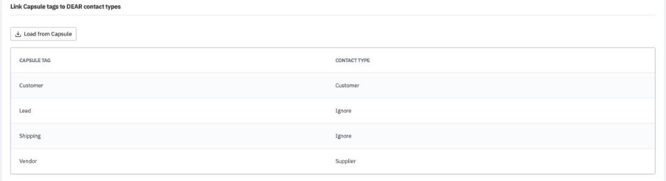 Note: Capsule does not automatically sync with Cin7 Core. Manual loading (Contact tags, Address types, Contacts) is required to update.
