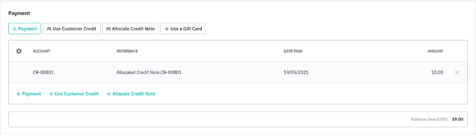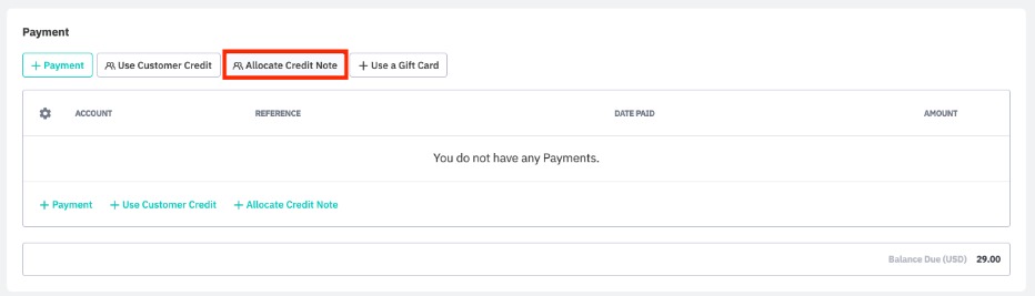 Note: The customer must have a credit note balance in order to allocate credit note balance to an invoice. Any available credit note balance from any other sale or standalone credit note can be used.