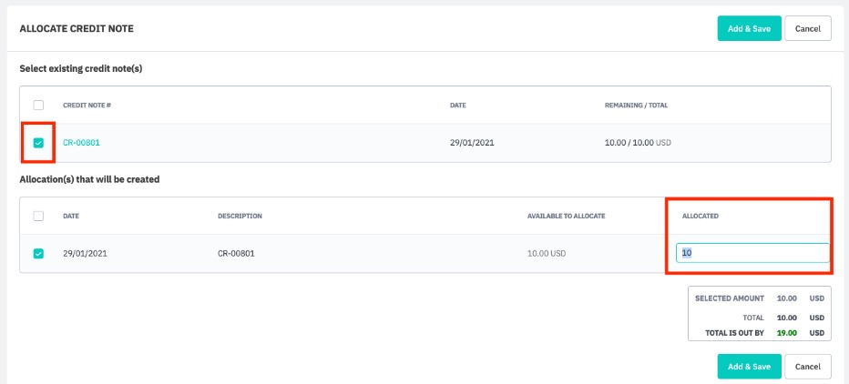 Check a credit note to allocate the balance to the invoice. You can click the Allocated field to edit the amount allocated.