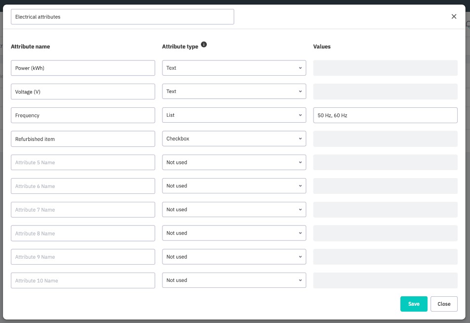 You can add up to 10 additional attributes per attribute set. Choose the Attribute Type for each attribute from the dropdown list. Available types are: