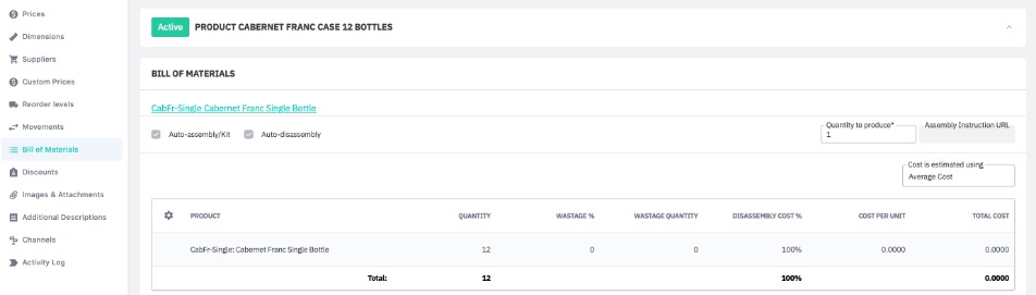 When viewing the additional product, you can see that in the Bill of Materials tab the information has been generated by the system automatically. It has auto-assembly and auto-disassembly enabled and also has a link to the base product.
