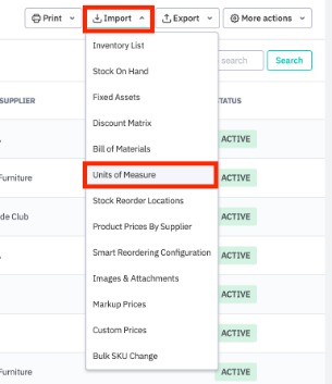 Import and export of the Units of Measure CSV takes place from the Products screen.