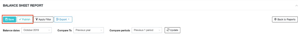 Balance sheet by periods can be Saved or Published to save a snapshot of the report and its settings where the data and date range cannot be changed.